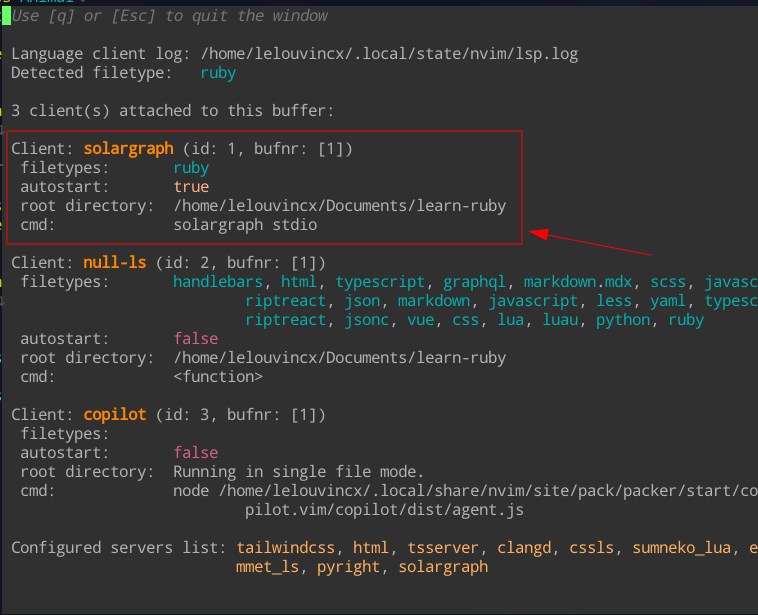 Xong! Bây giờ chỉ cần mở file Ruby và check :LspInfo, lúc này sẽ hiện 1 client có tên solargraph được attach vào buffer .rb: