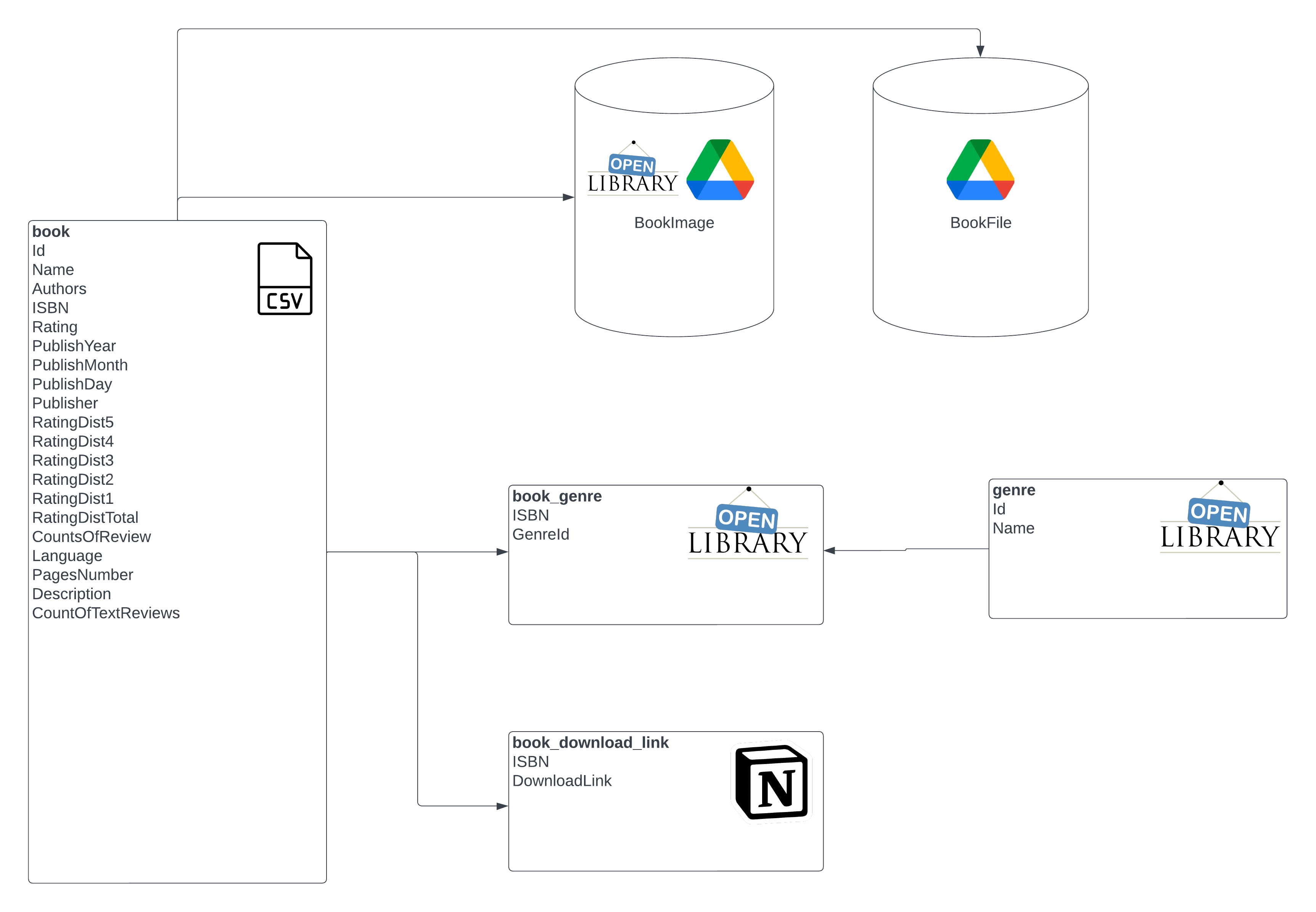 book: OLTP table chứa thông tin cuốn sách (ISBN, Authors, Rating, Description…)genre: table chứa tên các thể loại sáchbook_genre: quan hệ n-n giữabookvàgenrebook_download_link: table chứa link google drive để tham chiếuBookFilefiles: object storage chứa file download sách (.epub/.pdf/.mobi)images: object storage chứa hình ảnh cuốn sách