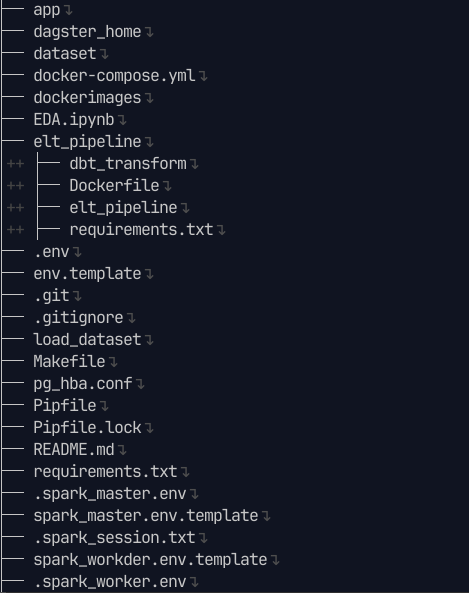 app: Giao diện để tương tác với người dùng, viết bằng streamlitdagster_home: Config cho dagit (dagster UI) và dagster daemondataset: Lưu dataset dưới dạng .csv, mặc định load vào MySQLdocker-compose: Compose docker containersdockerimages: Chứa các image tự build như dagster (dagit + daemon), spark master, streamlit appEDA.ipynb: Exploratory Data Analysis, xem trực tiếp tại đâyelt_pipeline: Toàn bộ pipelinedbt_transform: code location của dbt, dùng cho bước transform ở cuốiDockerfile + requirements.txt: Thông tin build imageelt_pipeline: pipeline từ đầu tới trước dbt