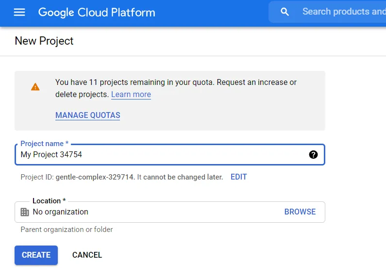 Điền tên của project vào (goodreads-elt_pipeline), tùy chọn location của bạn (mặc định No organization).