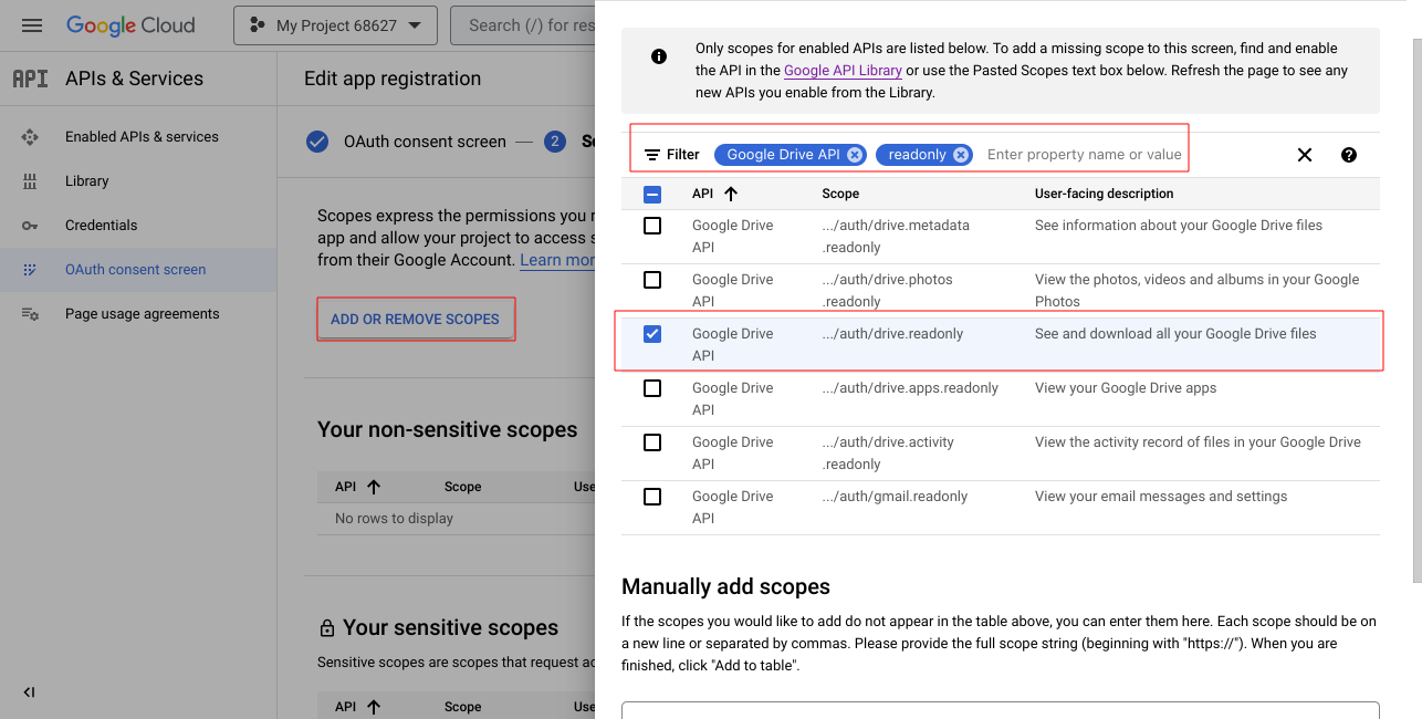 Ở mục scopes, chọn add or remove scopes, tìm google drive api, readonly rồi tick vào, save and continue tới hết